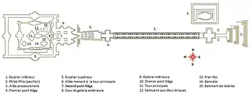 This final terrace leads to the outer gallery. It probably used to be a wooden gallery with a tiled roof, but only a raised floor of laterite remains. After the outer gallery one reaches the inner gallery, which is divided in long and narrow rooms. It served as a wall around the principal tower. This last gallery leads to the third and last naga bridge, another small copy of the first one.