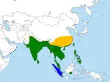 The pheasant-tailed jacana is a resident breeder in tropical India, Southeast Asia, and Indonesia; it overlaps greatly in range with the bronze-winged jacana, but, unlike the bronze-winged jacana, is found in Sri Lanka. It is found on small to large lakes having sufficient floating vegetation. It is sedentary in much of its range, but northern breeders from south China and the Himalayas migrate south from their breeding ranges to Southeast Asia and peninsular India, respectively. In Nanking, the birds leave in November and return for summer in the third week of April. Some birds arrive in the non-breeding plumage.[18] The species is resident in Taiwan, where it is considered endangered. Birds disperse in summer and have been recorded as vagrants in Socotra,[19] Qatar,[20] Australia and southern Japan (mainly Okinawa, Yonaguni, Ishigaki and Iriomote). The species tends to be commoner in lower elevations but climbs into the Himalayas in summer, and records exist of the species from altitudes of 3650 m in Kashmir (Vishansar Lake) and 3800 m in Lahul.[21][7][22]