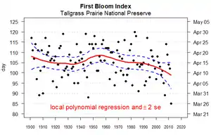 Historical day of year for first bloom index (FBI) for the Tallgrass Prairie National Preserve, Kansas (dots) fitted with a local polynomial regression model (loess in red) and a 2 standard error band (blue). Data from William Monahan.[16]