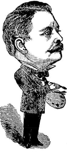 Goatcher left the ship at San Francisco, where he soon found work, then in 1870 was taken on at John McCullough's California Theatre, painting scenery with William Porter[5] for several of Wilson Barrett's productions. It was while working at the California that he first encountered David Belasco, J. C. Williamson and Maggie Moore.[6] A year later he was on the road again, touring Central America and the West Indies, where he notably painted a drop-curtain for the Kingston Theatre[lower-alpha 5] in Jamaica. In 1871 he was in New York, painting under Matt Morgan, one of America's great scenic artists.[6] He moved on to the old St James' Theatre, Boston, where W. H. Leake had the lease. From 1873 to 1875 he was in England, for much of that time in partnership with W. B. Spong, then abruptly and without saying goodbye,[8] left for America. For three years he was in Philadelphia, under contract to the Kiralfy brothers, decorating their newly-acquired Alhambra Palace Theatre,[5] and scenery for William E. Sheridan at the Chestnut Street Theatre[7] and in New York working at Abbey's Park Theatre. That was followed by ten years at Wallack's Theatre in New York, when he did some of his best and most important work, Antony and Cleopatra for the Potter-Bellew Company, and other productions for Edwin Booth, Wilson Barrett and Lillie Langtry. He was naturalized as a US citizen in 1882.[5] During this period he met William Elton, who would go on to an eminent career in Australia. In 1886 he was a scenic artist for Jeannette Thurber's American Opera Company. He claimed to have painted the scenes for the first American production of H.M.S. Pinafore.[9] During the summer breaks, Goatcher produced under contract numerous drop-scenes painted to give the impression of a lustrous fabric, such as satin, so effective that the deception was not seen until close up; they were used in various theatres across America. In 1888 he joined with John H. Young in Manhattan as Goatcher & Young, scenic designers, but despite lucrative contracts such as a Macbeth production starring Lillie Langtry, and a huge cyclorama depicting the Shenandoah Valley, the shop was a commercial failure.[5] He left with his sons James and Philip jnr for London, where he was engaged by the Adelphi Theatre, then in July 1890 was given a three-year contract by J. C. Williamson to work for him in Australia.[5]