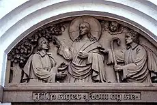 The altarpiece is a painting in a gilt carved frame by Danish artist Erik Jensen (1883-1974). The pulpit has gospel reliefs by M. Sørensen. Above the west entrance is a tympanon relief designed by Johan Rudolf Carl Nielsen (1863-1952). The inscription quoting the words of Philip the Apostle to Nathanael in John 1:45: "Come and see".[2] [3]