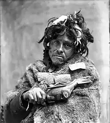 Tlingit Shaman, ca. 1900. Portrait of man wearing fur cape and carved amulet necklace, holding raven rattle