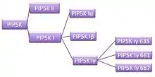 Type I phosphatidylinositol-4-phosphate 5-kinase (PIP5KI) are further classified as PIP5Kα, PIP5Kβ and PIP5Kγ on the basis of their basic differences in primary structure and the variation in the expression level in different compartment of cells, indicating that individual PIP5KI isoform has non identical function [5]. Moreover, PIP5Kγ, has three splicing variance; PIP5Kγ635, PIP5γ661, and PIP5Kγ687, making it one of the key regulators for producing PI(4,5)P2 that plays a role in diverse cellular processes.[6]