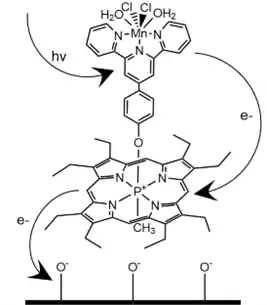 P-centered porphyrins typically react in redox reactions where they serve as tunable intermediate electron carriers in biological reactions for DNA degradation as well as other industrial catalytic reactions.[23] Tn (II/IV) oxide is photoreduced by iridium and manganese complexes through p-centered porphyrin electron carriers in catalysis.[4][5] Photovoltaic cells involving NiO complexes supplemented with high oxidation potential p-centered porphyrins improve cell efficiency as is the case in indium tin oxide cells with porphyrins containing axial carbazolylvinylnaphthalimides bound to a core phosphorus.[11][22]