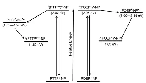 Phosphorus (V) porphyrins are particularly good electron carriers in redox reactions because of their adjustable reduction potential. Poddutoori et al. in 2021 investigated the electron transfer of naphthalene, a commonly excited molecule in photochemistry, to octaethylporphyrin and TEP. The relatively low potentials of the porphyrins yield highly energetic charge-separated states upon the transfer of the electron from naphthalene. The axial and peripheral substituent diversity is key to accessing the wide range of charge-separated states and electron transfer across electronically diverse reactants to form a great variety of redox products.[9]