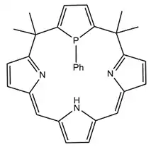Calixpyrroles have all four hydrocarbon bridges fully saturated, breaking the conjugation between heterocycles present in other porphyrinoids. A phosphole replacing a pyrrole allows for similar chemistry to other phophsaporphyrinoids with increased flexibility of the tetradentate ligand by virtue of sp3 hybridization.[15]