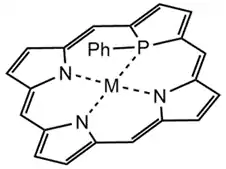 Two varieties of P-centered porhpyrins: phosphorus core porphyrin (left) and phosphaporphyrin coordinated to a general metal, M (right).