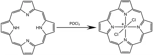 Later syntheses have been performed with other phosphorus precursors, including PhPCl2 and octaethylporphyrin (OEP) in DCM to yield [POEP(Cl)2]+Cl-.[9] PCl3/POCl3 and KPF6 yield similar porphyrin products with a PF6- counterion.[7][8] Other halogens like bromine have been used successfully in place of chlorine for this synthesis method of P-centered rings.[10] More syntheses with complex alcohols have been reported. Porphyrins functionalized with axial carbazolylvinylnaphthalimides are synthesized using similar methods to the previously described process for binding alcohols to phosphorus cores.[11] In a similar synthetic process, Susumu et al. linked several modified porphyrins in a center-to-edge bonding scheme. The chlorines on a P-centered porphyrin are first substituted by an external hydroxyphenyl group on another porphyrin. The substituent porphyrins are then refluxed with POCl3 to synthesize the final center-to-edge porphyrin array. The resulting P-centered complex consists of three porphyrins with phosphorus atoms bound at each core.[12]