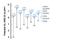 Figure 2 shows that in case of a p-type semiconductor/liquid junction photo generated electrons are available at the semiconductor/liquid interface under illumination. The reduction of redox species happens at less negative potential on illuminated p-type semiconductor compared to metal electrode due to the band bending at semiconductor/liquid interface. Figure 3 shows that thermodynamically, some of the proton-coupled multi-electron CO2 reductions are within semiconductors band gap. This makes it feasible to photo-reduce CO2 on p-type semiconductors. Various p-type semiconductors have been successfully employed for CO2 photo reduction including p-GaP, p-CdTe, p-Si, p-GaAs, p-InP, and p-SiC. Kinetically, however, these reactions are extremely slow on given semiconductor surfaces; this leads to significant overpotential for CO2 reduction on these semiconductor surfaces. Apart from high overpotential; these systems have a few advantages including sustainability (nothing is consumed in this system apart from light energy), direct conversion of solar energy to chemical energy, utilization of renewable energy resource for energy intensive process, stability of the process (semiconductors are really stable under illumination) etc. A different approach for photo-reduction of CO2 involves molecular catalysts, photosensitizers and sacrificial electron donors. In this process sacrificial electron donors are consumed during the process and photosensitizers degrade under long exposure to illumination.