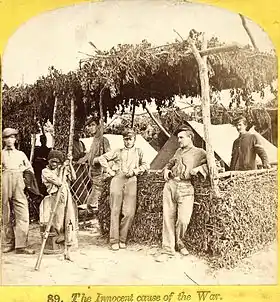 John Reekie (1829–1885) was another little known Civil War photographer. A Scotsman, Reekie was employed by Alexander Gardner. Reekie was active in Virginia, taking views at Dutch Gap and City Point, and in and around Petersburg, Mechanicsville and Richmond. Reekie's probably best known for his scenes of the unburied dead, on the battlefields of Gaines' Mill and Cold Harbor. One of his most well-known, "A Burial Party, Cold Harbor," was included with six others of his negatives in Gardner's Photographic Sketch Book of the War. It depicts African American soldiers gathering human remains on the Cold Harbor battlefield, almost a year after the battle.[47] This photograph is notable for being one of relatively few images depicting black soldiers at work in the war.[48]