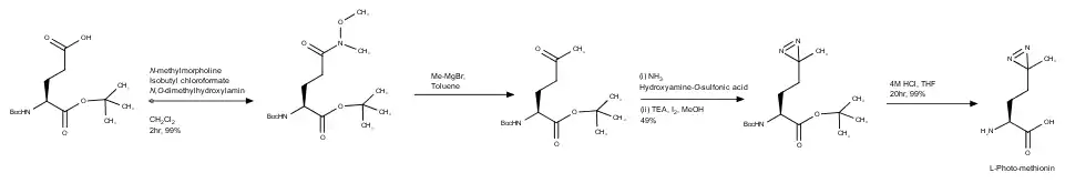 Racemic Photo-Methionine is synthesized from 4,4'-azi-pentanal by the Strecker amino acid synthesis.[1] The L enantiomer is separated by enzymatic resolution of the acetamide.