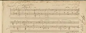 Beethoven's previous piano sonata, popularly known as Les Adieux, was composed almost five years before Op. 90. Beethoven's autograph survives and is dated August 16. The sonata was published almost a year later, in June 1815, by S. A. Steiner, after Beethoven made a few corrections.[1] Beethoven's letter to Prince Moritz von Lichnowsky, sent in September 1814, explains the dedication:
