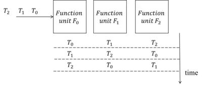 Pipelining allows different functional units of a system to run concurrently. Consider an informal example in the following figure. A system includes three sub-function units (F0, F1 and F2). Assume that there are three independent tasks (T0, T1 and T2) being performed by these three function units. The time for each function unit to complete a task is the same and will occupy a slot in the schedule.