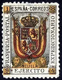 In 1893-94, Spain was engaged in the Margallo War, centred around the Spanish enclave of Melilla in North Africa which came under attack by local tribesmen. In 1893, Torres approached the Melilla garrison commander with an offer of free stamps and stationery for the soldiers, which the commander accepted without reference to the Spanish postal authorities.[28] Torres produced 51 different types of stamp which were supplied to the soldiers who applied them to the envelopes and used them to write home,[28] despite their mail already being free of charge. Their letters served to legitimise the stamps and give them value in the philatelic market.[29] In addition, Torres produced extra mail pieces which were sent to his friends and associates and retained many stamps for sale to collectors.[28]