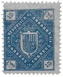 Curiously, however, Torres designs refer to Andorra as a republic, despite it being a co-principality shared by the Bishop of Urgel in Spain and the President of France, of which fact Torres must have been aware.[24] Christer Brunström has suggested that the use of the word republic may have been a deliberate error on Torres part in order to pander to Andorran republican or independence sentiment.[25] Despite approval by the assembly, the stamps were subsequently rejected by the French.[24] The stamp issue was thus shelved but later found its way on to the philatelic market.[24] Andorra did not issue its own postage stamps until the 1920s (Spain) and 1930s (France) when a dual postal system run by those countries was established in the state.[25][26]