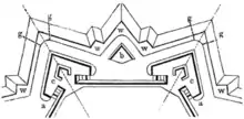 Plan of a bastioned fortification, with re-entrant places-of-arms marked W