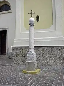 This plague cross is located next to the parish church. There is an inscription on the ball at the top which says: In Hoc Signo Vinces, the capital Deo Sacrum Christ Jesus, and on its base: Sicut Moses esaltavi Serpentem in Desert sic. On the stone block which forms the pedestal: Spes omnium Salus Fidellium Branda Scottus fecit proud. Anno Nativitatis MDLXX Maj I. The inscription of the year is likely incomplete because the column was built by Bernard Scotti in 1576.[1][8] It is also known as Cross Scotti.