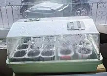 An electric seed-propagation mat is a heated rubber mat covered by a metal cage that is used in gardening. The mats are made so that planters containing seedlings can be placed on top of the metal cage without the risk of starting a fire. Another example is a seedling heat mat, multiple layers of durable, water resistant plastic material with insulated heating coils embedded inside (similar to underfloor heating systems, but with rubber mat instead of flooring).[9] In extreme cold, gardeners place a loose plastic cover over the planters/mats which creates a sort of miniature greenhouse. The constant and predictable heat allows people to raise seedlings in the winter months when the weather is generally too cold for seedlings to survive naturally outside. When combined with a lighting system, many plants can be grown indoors using these mats.[10] This can increase the variety of plants that a gardener can use.