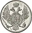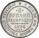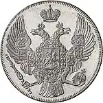 Minting began with 3-ruble coins, and 6-ruble and 12-ruble coins were added in 1829 and 1830, respectively.[2] 1,371,691 3-ruble coins were minted, along with 14,847 6-ruble and 3,474 12-ruble coins.[1] The first coin was sent to the prominent German scientist Alexander von Humboldt, who was previously asked to evaluate the use of platinum as a currency and confirm its price relative to silver. After his death, the emperor Alexander II bought that coin, and in 1859 it was returned to Russia and later became an exhibit of the Hermitage Museum in Saint Petersburg.[3]