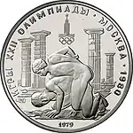 Reverse: Two wrestlers on the backdrop of ancient columns. Between the columns – the emblem of games, under the left column – the trade mark of the mint, bottom – the minting year, along the rim: "The Games of the XXII Olympiad. MOSCOW. 1980" Design: Ermakov Mint: Leningrad Mint (LMD).[6] |