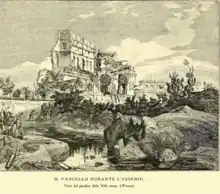 Between 1663 to1668, Plautilla designed and oversaw the construction of Villa Benedetti for Elpidio, known as Villa il Vascello (now largely destroyed).[1] Elpidio may have hired Plautilla because he wanted to construct a villa like nothing else in Rome.[4] Plautilla was assisted by her brother, Basilio.[4] The architecture was unusual, comprising loggias, curved walls and elaborate stucco.[4] Plautilla painted designs inside the villa, an allegory of Felicitas Publicas in the gallery, and an altarpiece of the Assumption of the Virgin for the chapel, alongside Pietro da Cortona, Francesco Allegrini and Giovanni Francesco Grimaldi.[4][7] The villa was nicknamed Villa il Vascello because it resembled a ship.[4] The plan was changed several times, including when Elpidio visited France in 1664 and was influenced by French architecture.[4] He asked Gian Lorenzo Bernini to modify Bricci's plan in 1664.[4]