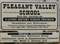 The Pleasant Valley School building is an example of a one-room country school that was common throughout Oklahoma during the late 1800s and early 1900s. The building was built in 1899 and continued to function as a one-room school until 1941. It remains the only extant one-room, frame school building in Payne County. It is one of the very few in Oklahoma still located on its original site and still playing the role of an educational and social center.[1][2]