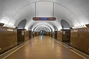 Ploshchad Lenina is a deep underground pylon station at 67 metres (220 ft) depth. The underground hall was designed by architect A.K. Andreev.