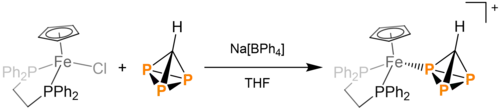 HCP3, upon addition of [(dppe)Fe(Cp*)]Cl (dppe = 1,2-bis-(diphenylphosphino)ethane) in sodium tetraphenylborate and THF, undergoes salt metathesis and produces [(dppe)Fe(Cp*)(HCP3)][BPh4]. This product is crystallizable, producing purple crystals. This product is prone to decomposition back to HCP3.[5]