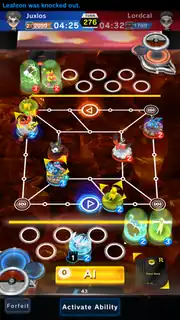Pokémon Duel was a free-to-play digital board game set in the Pokémon franchise. Gameplay is based on that of the Pokémon Trading Figure Game. Two players use teams of six Pokémon figurines, each with unique "moves" and "abilities". Both players start with all figures on the "bench" and attempt to reach a goal point on the opposite side of the board while preventing their opponent from doing the same. Figures may "battle" adjacent ones, with battles involving roulette-styled wheels with differing-sized segments from which a move is chosen randomly. Moves have one of several colors, and the colors of the battling figures' moves determine the outcome of the battle. White and gold moves deal numerical damage; the figure which spins a lower damage value is knocked out and moved to the "P.C.", temporarily decommissioning it. Purple moves, which often give detrimental status effects to opponents, beat white moves but lose to gold moves. Blue moves beat all other colors, but often have no effect of their own, simply cancelling the battle. Red "miss" moves lose to any opposing move. Enemy figures may also be "surrounded" by occupying all adjacent spots; this knocks the surrounded figure out without initiating battle. Players may also use "plates" which give additional effects for figures such as dealing additional damage or moving them in ways not otherwise permitted. A player may select up to six plates as part of setting up their "deck" of figures.[2] In addition to reaching the goal point, a player may also win by forcing their opponent to run out of time (5 minutes in a multiplayer game) or by leaving their opponent unable to make a valid move on their turn (a "wait win").[3]