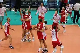 On 30 August 2014, Poland played their historic match at the National Stadium in Warsaw against Serbia as opening meeting of the 2014 World Championship.[38] It was the opening match of the World Championship 2014 in Poland.[39] Polish team won 3–0 and with attendance over 62,000 audience.[40] In their first group, Pool A, Poland won all 5 matches and lost just one set with Cameroon. In their second group, Pool F, the host team won 3 of their 4 matches. On 10 September 2014, they lost to the United States (1–3), but then beat the national teams of Italy (3–1), Iran (3–2) and France (3–2).[41] Poland took second place in Group F. The breakdown in the next stage of the tournament was decided by drawing lots. Poland went into group H with Brazil and Russia. Some commentators and fans called Pool H the "Group of Death", but it was a happy result for the home team. The Polish national team won two dramatic matches after tie-breaks at Atlas Arena in Łódź. On 16 September 2014 they beat Brazil. Poland's main scorer in the match was Mariusz Wlazły, who gained 31 points for his team.[42] Two days later, Poland needed just two winning sets for promotion to the semi-final. Poland beat Russia and took first place in the group.[43] On 21 September 2014 the Polish team won the semi-final match against Germany, which guaranteed for Poland their third ever medal at the World Championship.[44][45][46] On 21 September 2014 Poland won the title of World Champion 2014, for the first time in 40 years.[47] Poland beat Brazil (3–1).[48][49] Polish players received 3 of 8 the individual awards in the tournament: Karol Kłos as Best blocker, Mariusz Wlazły as Best opposite and Most valuable player.[50][51] After victory Poland have risen two places in FIVB ranking and has been taken 3rd place.[52]