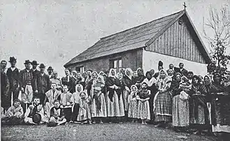 History of Poles in Bosnia begins during the Ottoman rule, but a significant influx only took place following the Austro-Hungarian occupation of Bosnia and Herzegovina in 1878.[1] The occupying authorities wished to colonize the country with politically reliable people, whom they rewarded with land and benefits.[2] Germans and Hungarians were not considered suitable, while Croatians and Serbians were not desirable. The authorities decided on Poles and Czechs, expecting their Slavic roots to help them acclimatize well among Bosniaks.[1] Official settlement lasted from 1896 until 1906.[3] The Polish settlers were predominantly ethnic Roman Catholic farmers from the Kingdom of Galicia and Lodomeria, a crown land of Austria. Along with them came the Eastern Orthodox Ruthenians. Civil servants, physicians, engineers and lawyers,[2] all driven by expectations of fast career advancement and higher wages,[1] were also among Polish settlers.[2] The farmers were settled in the flatlands of Bosanska Krajina and Posavina, mostly in the vicinity of Prnjavor, Derventa, Bosanska Gradiška, Banja Luka, Bosanski Novi and Prijedor. In the areas surrounding Prnjavor and Bosanska Gradiška, there existed villages inhabited solely by Poles; Poles otherwise lived in villages with Bosnian Serbs or, less commonly, in villages with Bosnian Croat majority.[2] The two largest Polish colonies in Bosnia and Herzegovina, Rakovac (Polish: Rakowiec) and Novi Martinac (Nowy Martyniec) near Prnjavor, were formed between 1899 and 1901.[3]