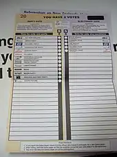 Almost all parliamentary elections between 1853 and 1996 were held under the first past the post (FPP) electoral system.[18] Under FPP the candidate in a given electorate (district) that received the most votes was elected to the House of Representatives. The only deviation from the FPP system during this time occurred in the 1908 and 1911 elections when a second-ballot system was used; the second-ballot legislation was repealed in 1913.[18] The elections since 1935 have been dominated by two political parties, National and Labour.[18]