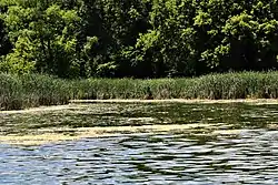In its upper course the river flows through a morainic region of numerous lakes, in a course characterized by meadows and wooded hills, as well as marshy stretches near areas where the river passes through lakes. The largest lakes on the river include Ten Mile Lake in Otter Tail County; Pomme de Terre and Barrett Lakes in Grant County; and Perkins Lake in Stevens County. The water levels of several lakes on the river's course are maintained by small dams. Downstream of Morris, the river flows on till plains between eroding banks and becomes increasingly turbid. According to the Minnesota Pollution Control Agency, approximately 81% of the land in the Pomme de Terre River's watershed is used for agriculture; of this area, half is used for the cultivation of corn and soybeans, and 43% for that of hay and small grains.[8][10][11]