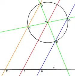 - This parallel also intersects the black line m at E, defining one end of the line segment.