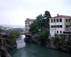 The construction of the bridge, designed by engineer Guallini and inaugurated in 1860, was carried out by the Meazza company.[1] Its realization was part of a broader project to modernize the city of Ivrea, which until then had only one bridge, the Ponte Vecchio, which dated back to Roman times.[1][2] The new bridge absorbed the majority of the traffic, as it was located along the axis connecting the city center to the Ivrea railway station.[1]