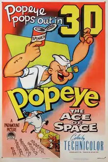 Popeye, the Ace of Space is a 1953 3D theatrical cartoon released as a Stereotoon.[1] It was produced by Famous Studios for the Stereotoon series featuring Popeye and distributed by Paramount Pictures.[2] It was the first of two Paramount cartoons to be created in 3D format but with unsatisfying results. The other was Boo Moon with Casper the Friendly Ghost.[3] Aiming to make a big impression on audiences, Paramount allocated additional funding for the Stereotoons which more than doubled the amount usually budgeted for Famous Studios cartoons of the day.[4]