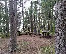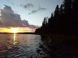 Woody River Recreation Site (52°28′45″N 101°42′03″W / 52.4791°N 101.7009°W)[17] consists of separate parcels of land plus additional Crown land centred around several lakes, Woody River, and Midnight Creek in the Porcupine Hills. Access is from Highway 980, which connects all of the lakes and amenities in the park, and by snowmobile. When travelling by snowmobile from the town of Hudson Bay, there are two warm-up shelters along the way.[18] Accessible lakes within the East Block include Isbister, Spirit, Smallfish, Woody, Elbow, and Townsend. All six lakes have boat access and fish commonly found in the lakes include walleye, perch, and northern pike. Campsites and picnic areas exist at Spirit, Isbister, Smallfish, and Townsend Lakes.[19] A rough ATV trail begins at the Spirit Lake Campground and heads north-east past Spirit Mountain and goes to Armit Lake, which is the largest lake in the Porcupine Hills.