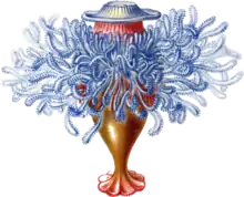 All chondrophores possess small tentacles that are known to cause minor irritation to human skin. They live at the surface of the open ocean, and are colonies of carnivorous, free-floating hydroids whose role in the plankton community is similar to that of pelagic jellyfish. The structures that cause their buoyancy – floats – are gas-filled membranes in other chondrophores. The floats are not obvious in this species from Haeckel's description, and have not been formally described, although the strange hat-like structure on the hydrozoan's aboral side may have this function.[5] The hydroid colony itself closely resembles the tentacles of a scyphozoan; however, each tentacle structure is an individual zooid, which may consist of a medusa or a polyp.[6] Each strand consists of numerous branchlets, which all end in stinging nematocysts.