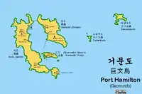 Komundo or Port Hamilton, officially Geomun-do (Korean: 거문도; Hanja: 巨文島/巨門島; RR: Geomun-do), is a small group of islands in the Jeju Strait off the southern coast of the Korean Peninsula, located approximately at 34°1′35″N 127°18′45″E / 34.02639°N 127.31250°E. The islands are 12 km2 (4.6 sq mi). There are three principal islands, the two larger ones, Sodo to the west (Seo-do, 서도, 西島) and Sunhodo to the east (Dong-do, 동도, 東島) forming a harbor with the smaller island in the center. On this central island, Observatory Island (or Go-do, 고도, 古島), there was a British naval base from 1885 to 1887.