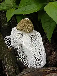 Phallus indusiatus, commonly called the bamboo fungus, bamboo pith, long net stinkhorn, crinoline stinkhorn or veiled lady, is a fungus in the family Phallaceae, or stinkhorns. It has a cosmopolitan distribution in tropical areas, and is found in southern Asia, Africa, the Americas, and Australia, where it grows in woodlands and gardens in rich soil and well-rotted woody material. The fruit body of the fungus is characterised by a conical to bell-shaped cap on a stalk and a delicate lacy "skirt", or indusium, that hangs from beneath the cap and reaches nearly to the ground. It was first described scientifically in 1798 by French botanist Étienne Pierre Ventenat. Mature fruit bodies are up to 25 cm (9.8 in) tall with a conical to bell-shaped cap that is 1.5–4 cm (0.6–1.6 in) wide. The edible mushroom, grown commercially and commonly sold in Asian markets, is rich in protein, carbohydrates, and dietary fiber. It also contains various bioactive compounds, and has antioxidant and antimicrobial properties. Phallus indusiatus has a recorded history of use in Chinese medicine extending back to the 7th century AD, and features in Nigerian folklore.