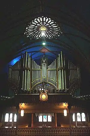 The interior of the Basilique Notre-Dame de Montréal (in English, Notre-Dame Basilica) in Québec, Canada. The ceiling is coloured deep blue and decorated with golden stars, and the rest of the sanctuary is a polychrome of blues, azures, reds, purples, silver, and gold. The basilica is filled with hundreds of intricate wooden carvings and several religious statues.