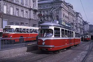 E1 class and K class trams emerge from underground track on the Währingerstraße ramp in Vienna, Austria, while a bus drives by on the adjacent street in 1970.