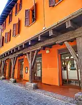 The porticoes of Bologna were built almost spontaneously, probably in the early Middle Ages, as a projection of private buildings on public land, in order to increase living spaces. The first historical evidence dates back to 1041.[4] In a first period the houses were increased by the expansion of upper floors and the creation of wooden projections. Over the years, the jetties increased in size and it was necessary to build support columns from below to prevent them from collapsing, thus creating the worldwide famous arcades.[5]