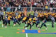 It is not clear when the first powderpuff football game was played, although there is photographic evidence of it being played as early as 1931 at Western State College of Colorado (now Western State Colorado University) in Gunnison, Colorado.[1] One of the first well-documented powderpuff football games was played on October 20, 1945, at Eastern State Teachers College, in Madison, South Dakota.[2] Eastern State Teachers College had previously cancelled many campus activities for the duration of World War II. Among these events were the annual homecoming celebration and intercollegiate sports, including football.[3]