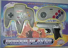 The units resemble a Nintendo 64 controller, sometimes with a cartridge slot for Famicom games. They come packaged with a secondary 9-pin 6 button controller resembling a Sega Genesis controller, intended for a second player. They are packaged with a 9-pin light gun resembling a Walther PPK pistol. There is a non-moving joystick, added for visual appeal. Though the Power Player Super Joy's button layout is identical to that of the Nintendo 64 controller, the buttons have been mapped differently. The C buttons of the Nintendo 64's controller function as A and B on the Super Joy, the A and B buttons of the Nintendo 64's controller are Start and Select on the Super Joy, respectively. Finally, the N64 controller's Start button is the Reset button on the Super Joy. The units are available in multiple colors, including black, grey, red, and blue.