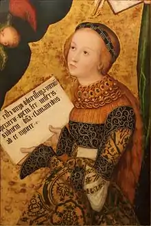 - ↑ Lucas Cranach Archive: Prague Altarpiece [left wing, fragment]: Female saint (Agnes?) with a page