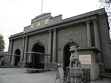 The current gate, rebuilt in 1929, was a western-style gate with ionic columns. Two stone lions stood on either side of the gate. As the HQ of the Nationalist Government, the sign on the gate read Nationalist Government (國民政府) from 1929 to 1937 and from 1946 to 1948. During the Japanese occupation of Nanjing, it served as the main gate of Legislative Yuan and Control Yuan of the Wang Jingwei regime. After the constitutionalism and the presidential election in 1948, the sign was changed to "Presidential Palace" (總統府), which it remains until today. Nowadays, it is not only a significant symbol in downtown Nanjing, but also served as the main entrance to the Presidential Palace.