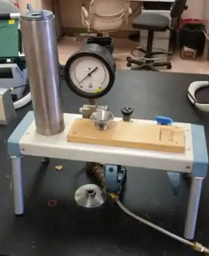 A pressure bomb, pressure chamber, or Scholander bomb is an instrument that can measure the approximate water potential of plant tissues. A leaf and petiole or stem segment is placed inside a sealed chamber. Pressurized gas (normally compressed nitrogen) is slowly added to the chamber. As the pressure increases, at some point the liquid contents of the sample will be forced out of the xylem and will be visible at the cut end of the stem or petiole. The pressure that is required to do so is equal and opposite to the water potential of the sample (Ψleaf or Ψtotal).[1][2] Pressure bombs are field portable and mechanically simple,[3] which make them the predominant method for water potential measurements in the fields of plant physiology and ecophysiology.