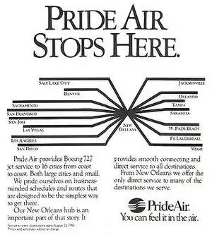 Pride Air was a United States airline that operated for three months during 1985. Pride Air was based out of New Orleans International Airport (MSY).