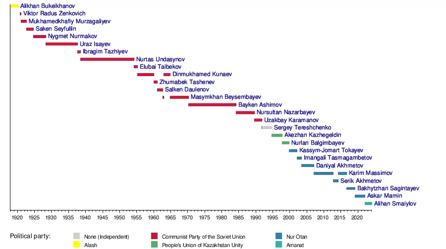 Alihan SmaiylovAskar MaminBakhytzhan SagintayevKarim MassimovSerik AkhmetovDaniyal AkhmetovImangali TasmagambetovKassym-Jomart TokayevNurlan BalgimbayevAkezhan KazhegeldinSergey TereshchenkoUzakbay KaramanovNursultan NazarbayevBayken AshimovDinmukhamed KunaevUraz IsayevNygmet NurmakovSaken SeyfullinViktor Radus ZenkovichAlikhan Bukeikhanov